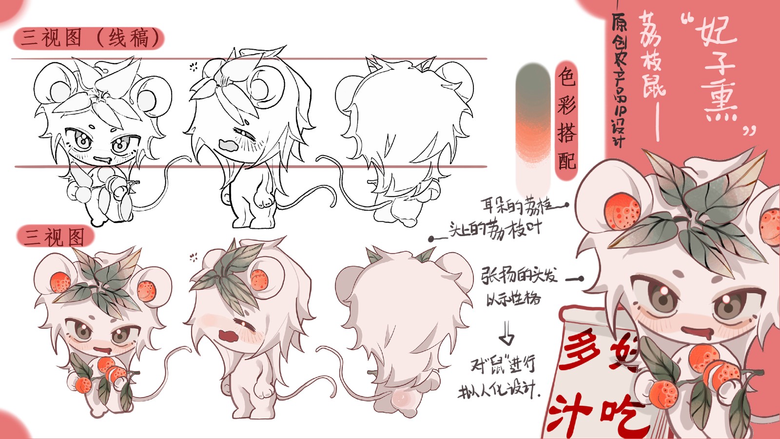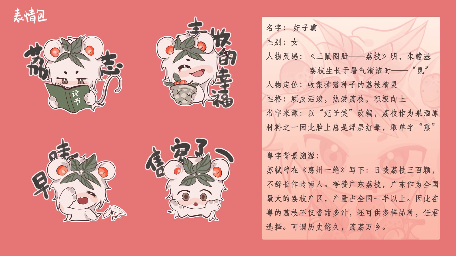 人物灵感:《三鼠图册--荔枝》明,朱瞻基荔枝生长于暑气渐浓时--“鼠”人物定位:收集掉落种子的荔枝精灵性格:顽皮活泼,热爱荔枝,积极向上名字来源:以“妃子笑”改编,荔枝作为果酒原材料之一因此脸上总是浮层红晕,取单字“熏”